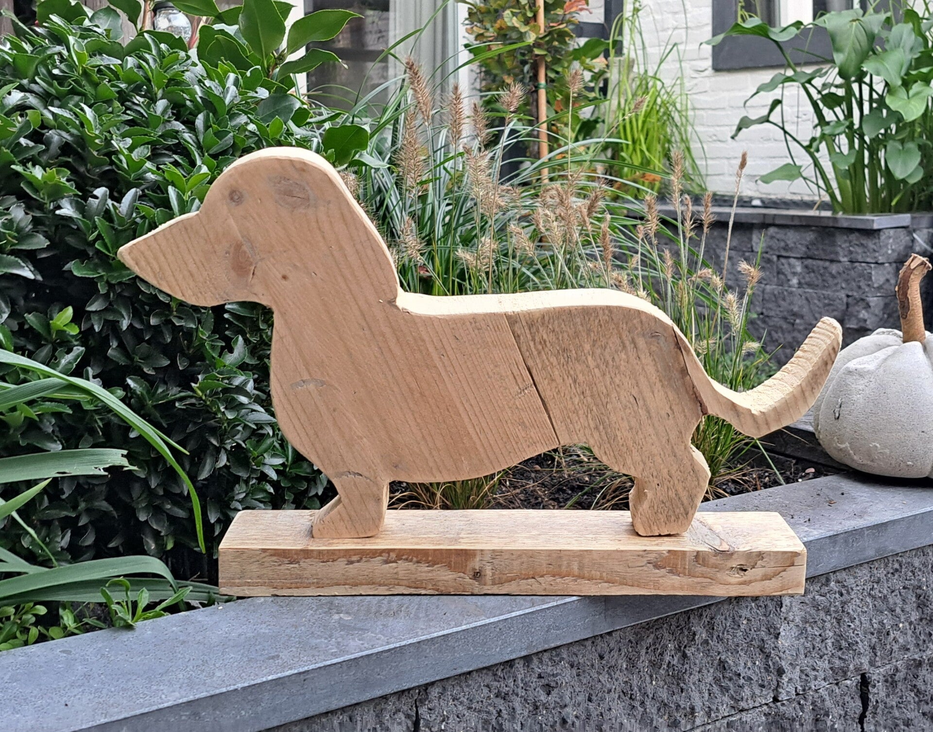 Teckel kortharig. Gebruikt steigerhout. Ongeveer 39x 26 cm.