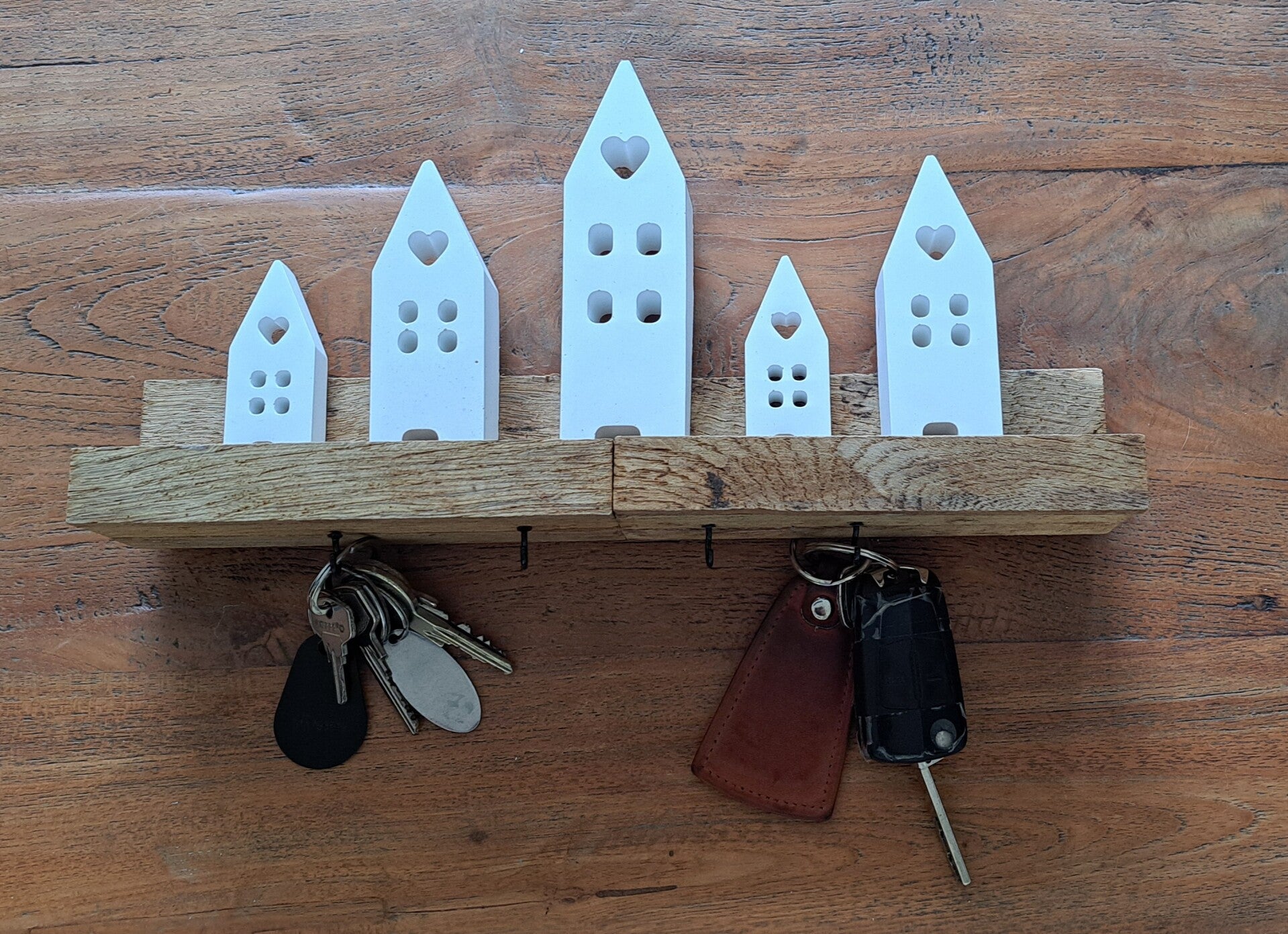 Sleutelrekje witte gipsen huisjes op eikenhouten rekje.